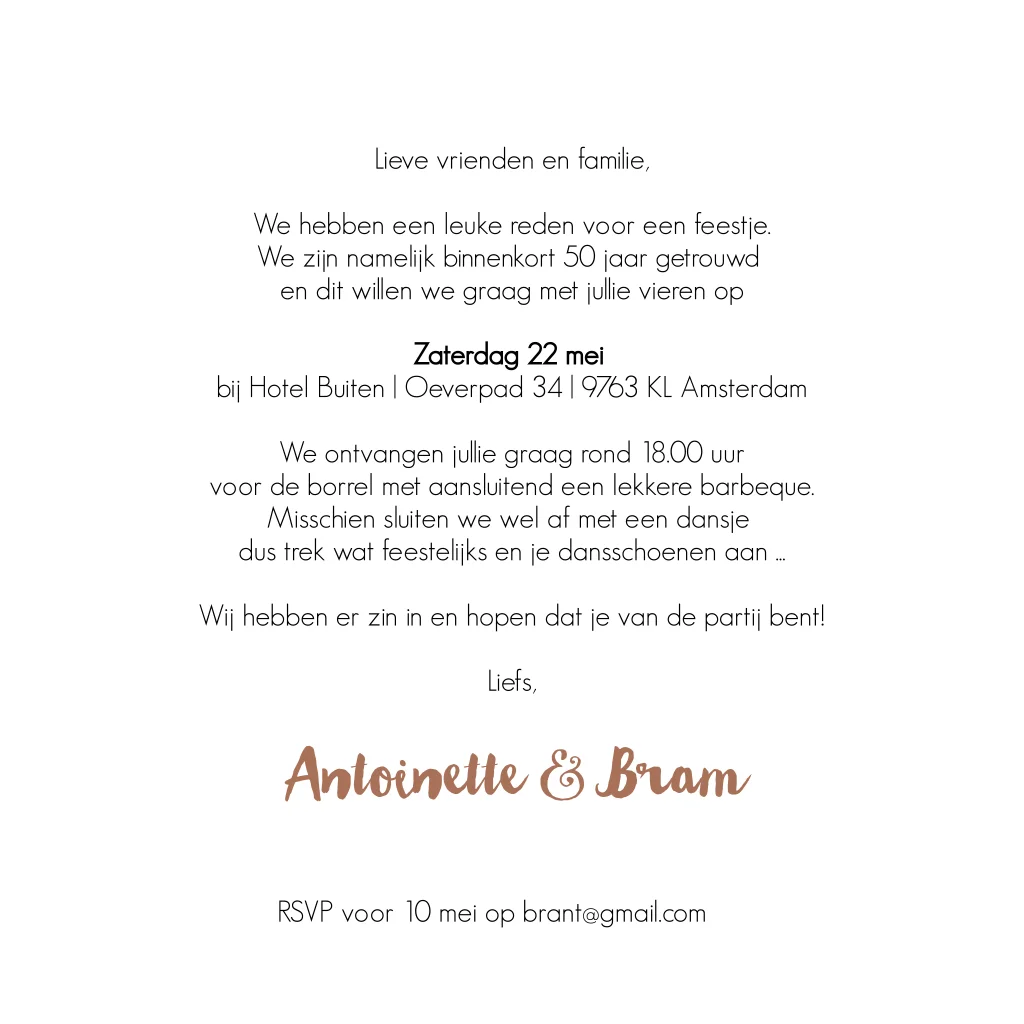 Deze fotocollage uitnodiging 50 jaar getrouwd kun je zo klassiek of trendy maken als je zelf wilt. Plaats 3 mooie portretten en pas de teksten aan. (23501)