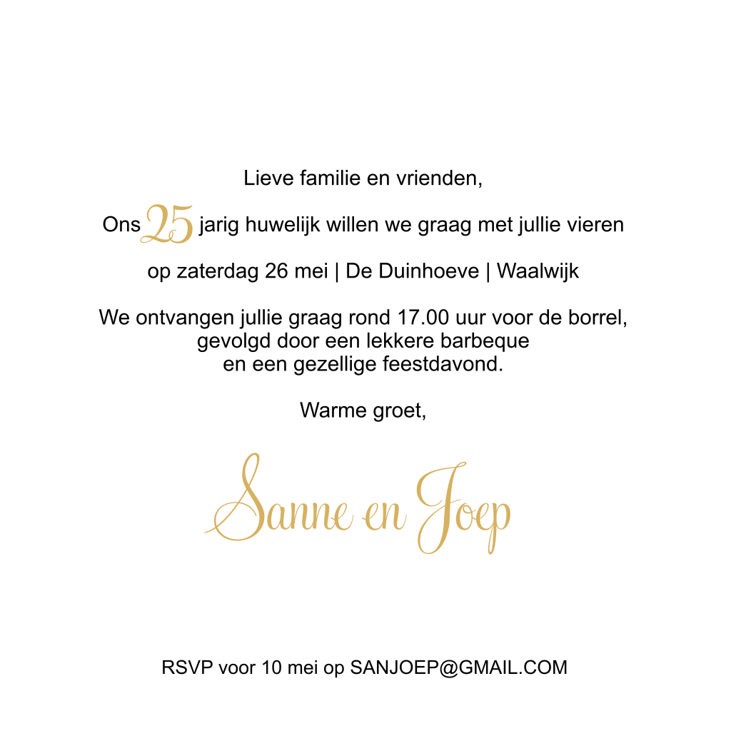 Maak een super persoonlijke uitnodiging voor je huwelijks jubileum. Vervang de foto's en let op dat ze goed onder de witte lijnen komen te staan. Alle teksten zijn aan te passen en het jubileumjaar ook. (22012)