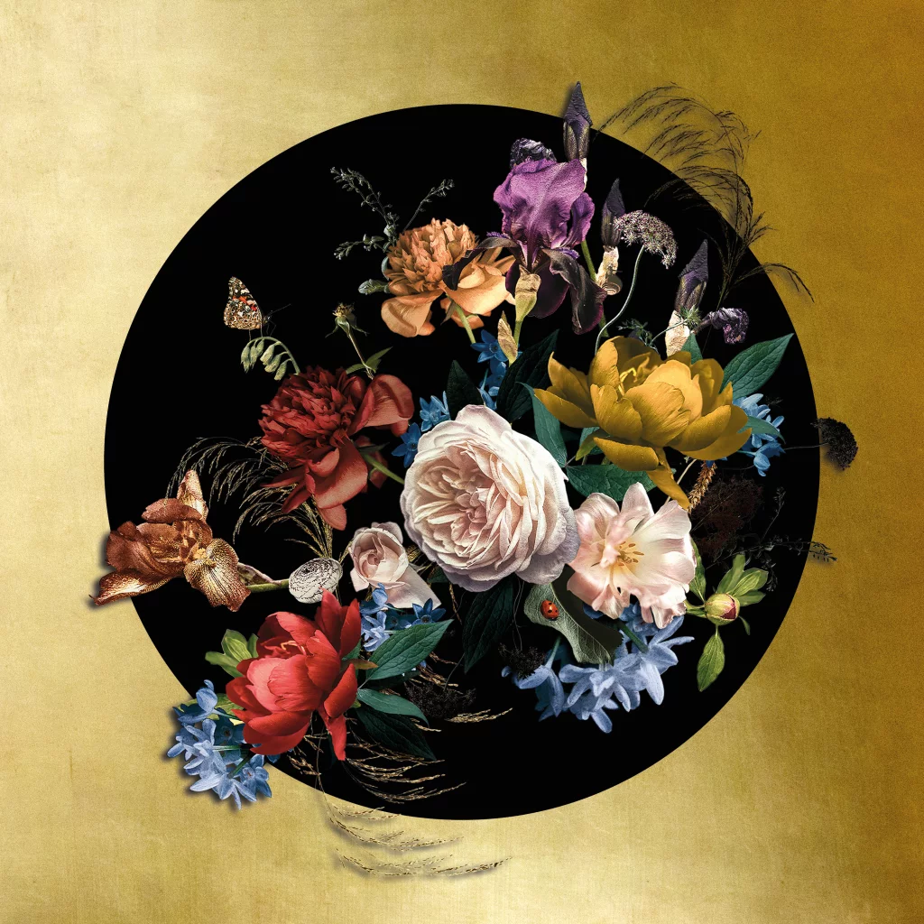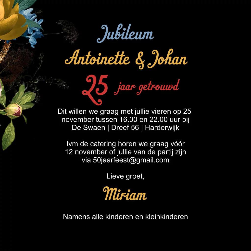 Prachtige uitnodigingskaart jubileum 25 jaar getrouwd met boeket en goudlook accenten. Binnenzijde ook versierd met uitbundige bloemenpacht. (24065)