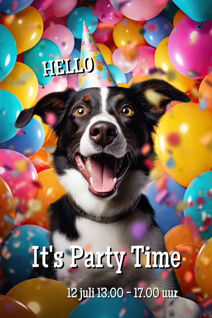 Super vrolijke uitnodigingskaart feestje met een blije hond en heel veel ballonnen. Plaats binnen nog een leuke foto van jezelf en pas de teksten aan. (24195)