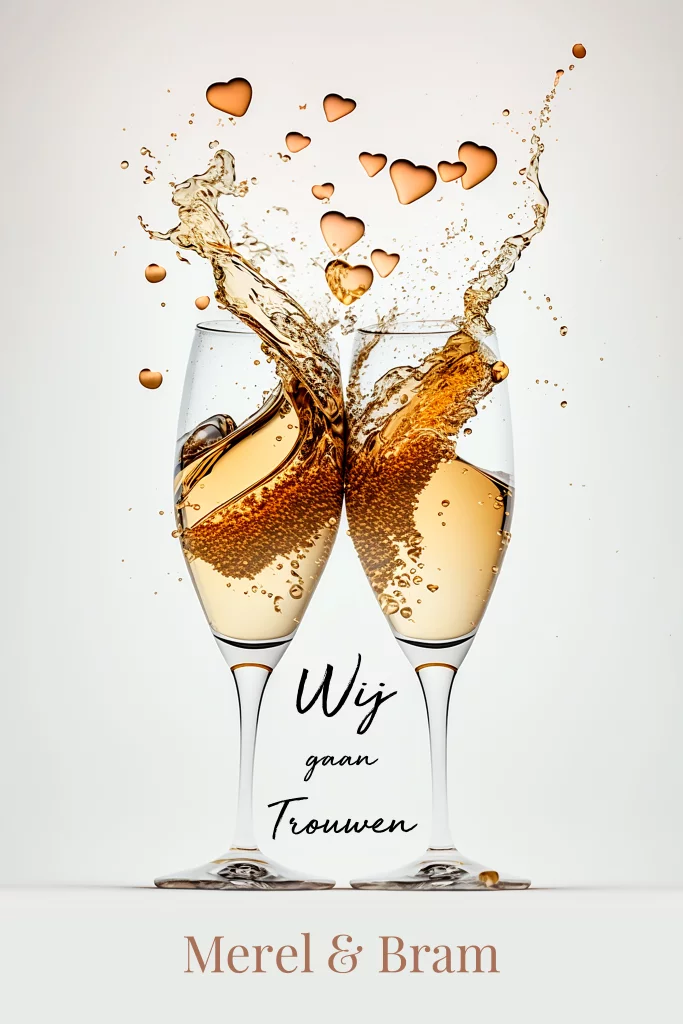 Uitnodiging trouwen trouwkaart staand formaat. Met klinkende champagne glazen en sprankelende hartjes. Binnen ruimte voor je eigen foto. (24084)