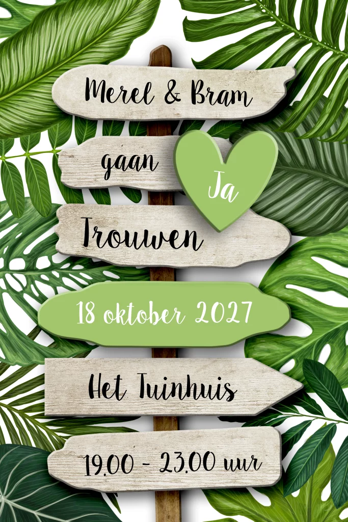 Hippe trouwkaart. Een wegwijzer van houten bordjes en veel botanisch blad. Alle teksten zijn aan te passen en binnen is ruimte voor je eigen foto. (21423)