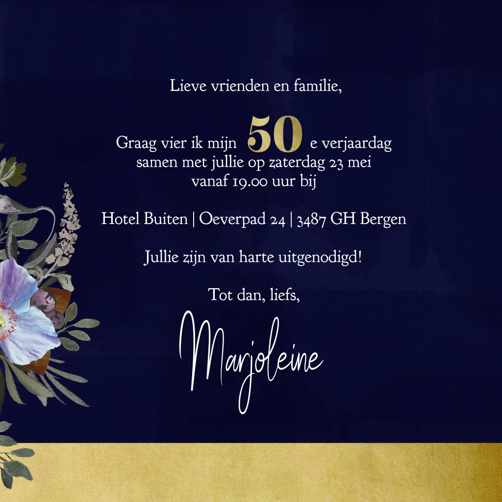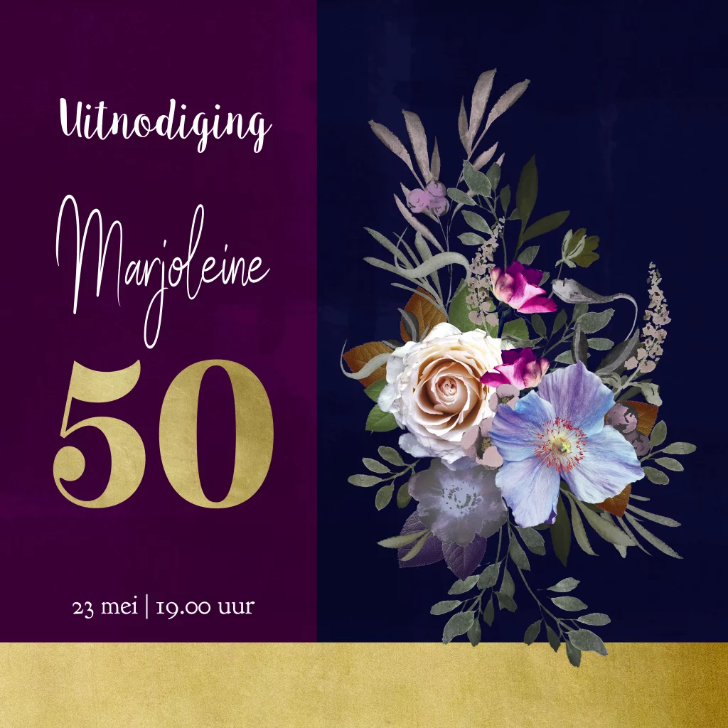 Uitnodiging 50 jaar verjaardag bloemen purple goudkleurig