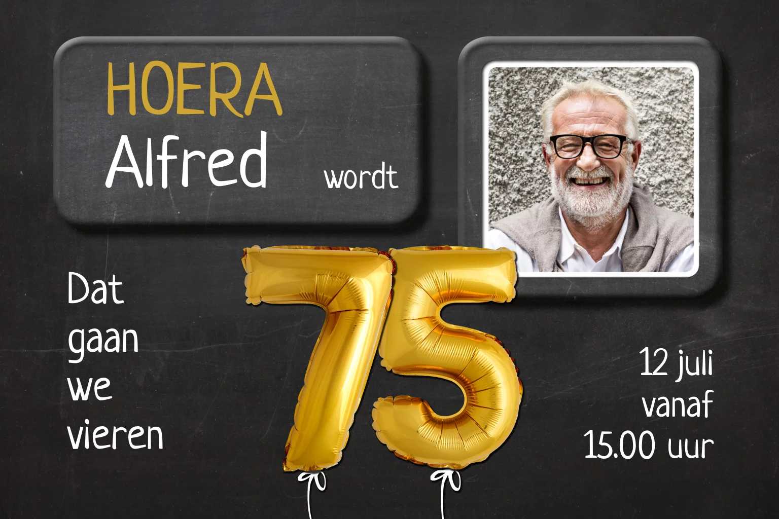 Leuke uitnodiging voor 75e verjaardag. Met krijtbord achtergrond, gouden ballonnen 75 en eigen foto. (22724)