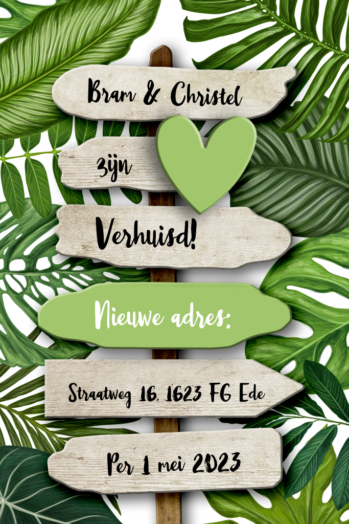 Verhuisbericht met houten wegwijzer bordjes. Alle teksten zijn te wijzigen. Hip en Trendy. (21424)