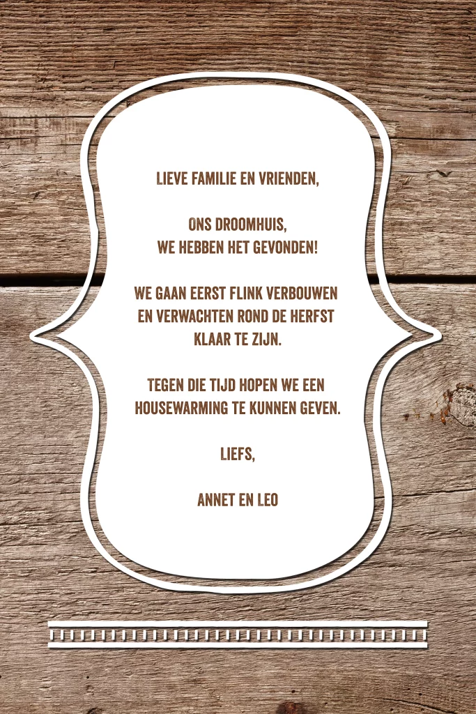 Stoere adreswijziging met achtergrond van ruw hout en fotokader voor foto van je nieuwe huis. Binnen ruimte voor het adres en aanvullende teksten. (21824)