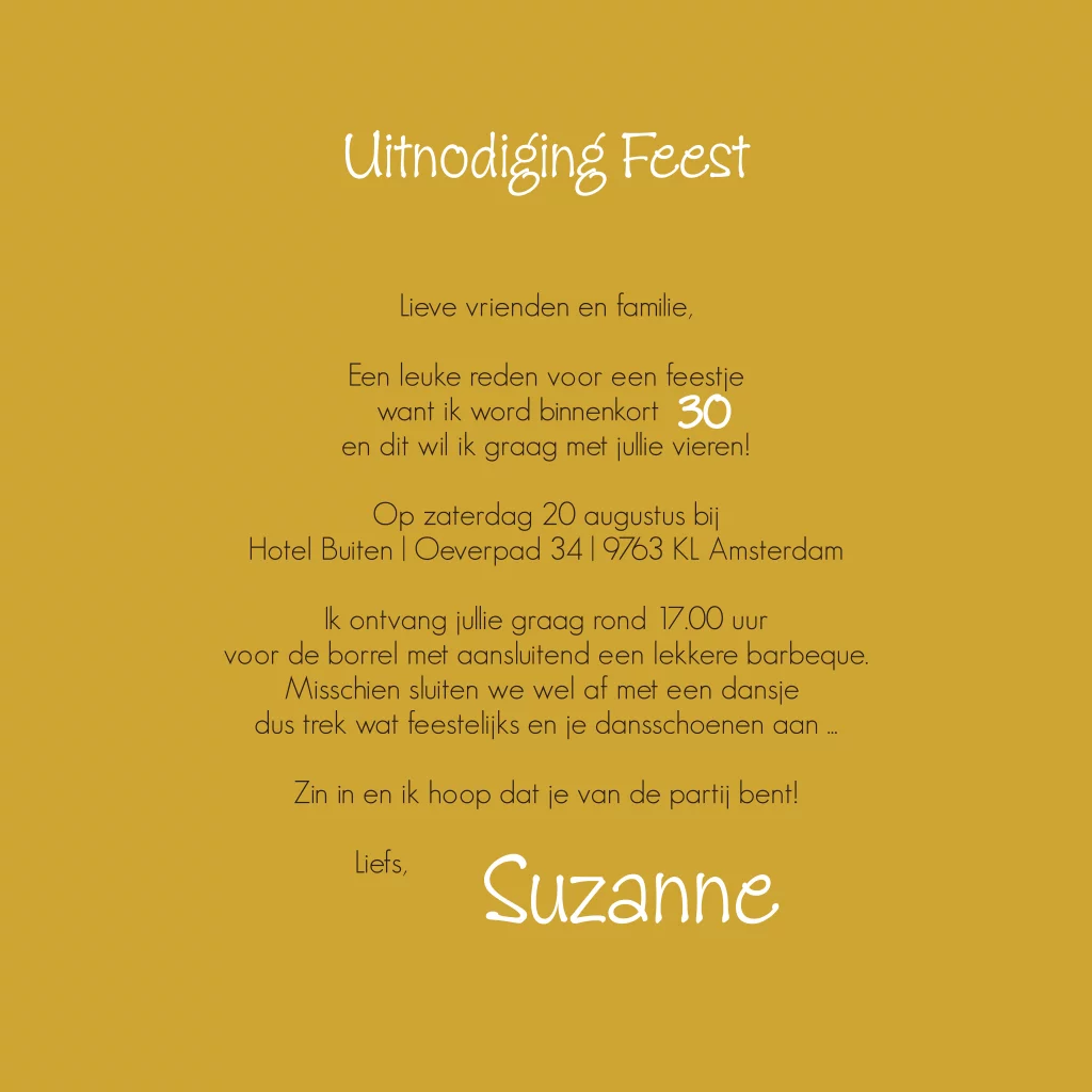 Vrolijke uitnodiging 30e verjaardag. Met gouden ballonnen en confetti. De kleur van de achtergrond binnenin is te wijzigen. (23948)
