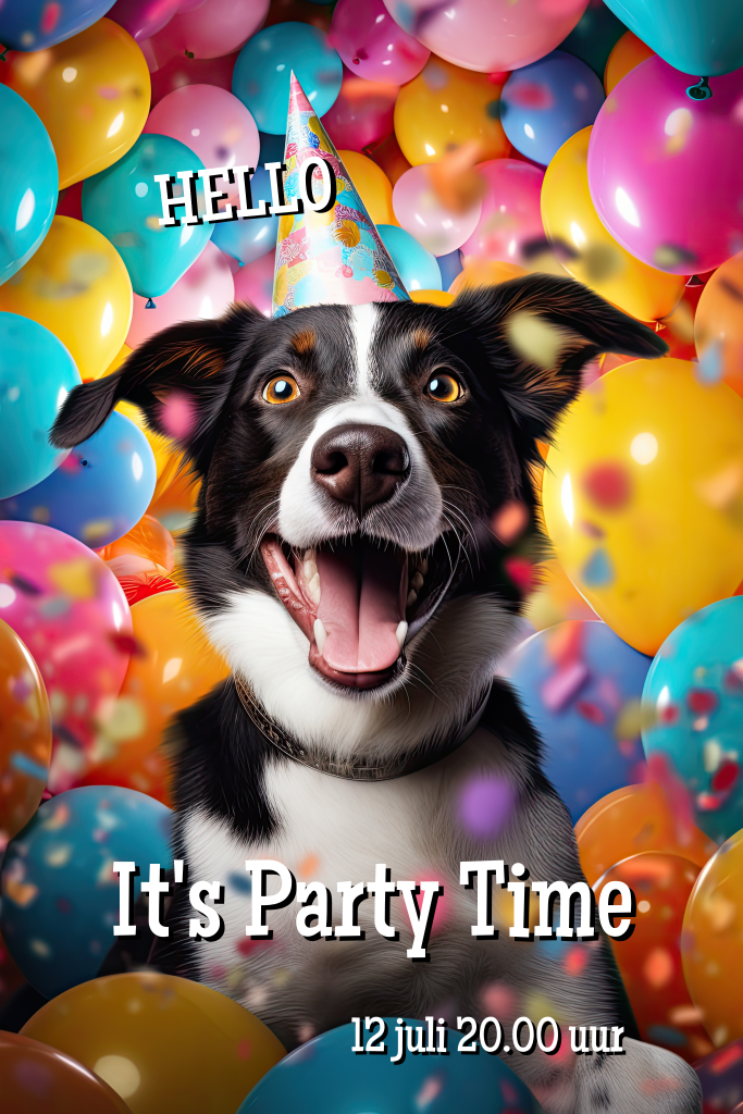 Joehoe het is feest. Een super vrolijke uitnodiging voor je feest met een blije hond. Plaats binnenin nog een leuke foto van jezelf! (24185)