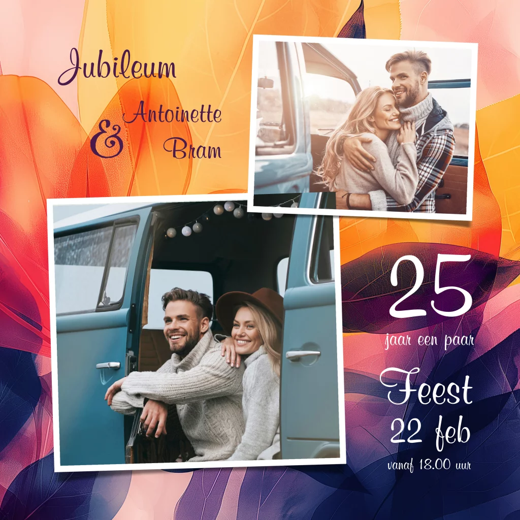 25 jaar getrouwd vrolijke uitnodiging met bladmotief in geel, paars, oranje en roze. Plaats jullie eigen foto's en maak zo een bijzondere collage uitnodiging. (23867)