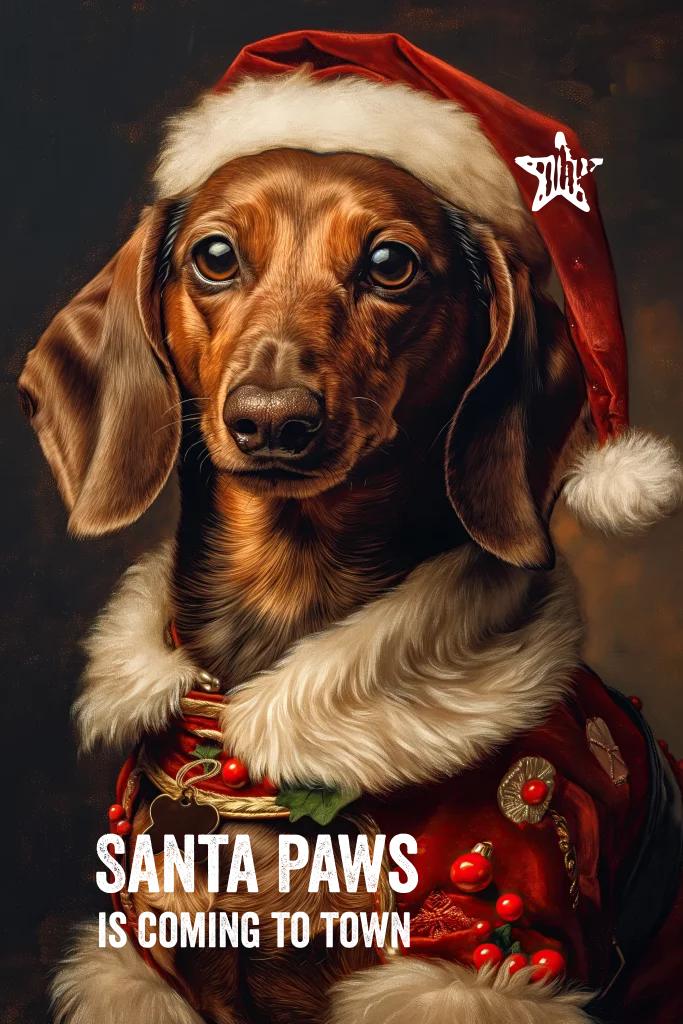 Een in kerstkleding uitgedoste teckel. Met tekst in goudfolie "Santa Paws is coming to town". (24203)