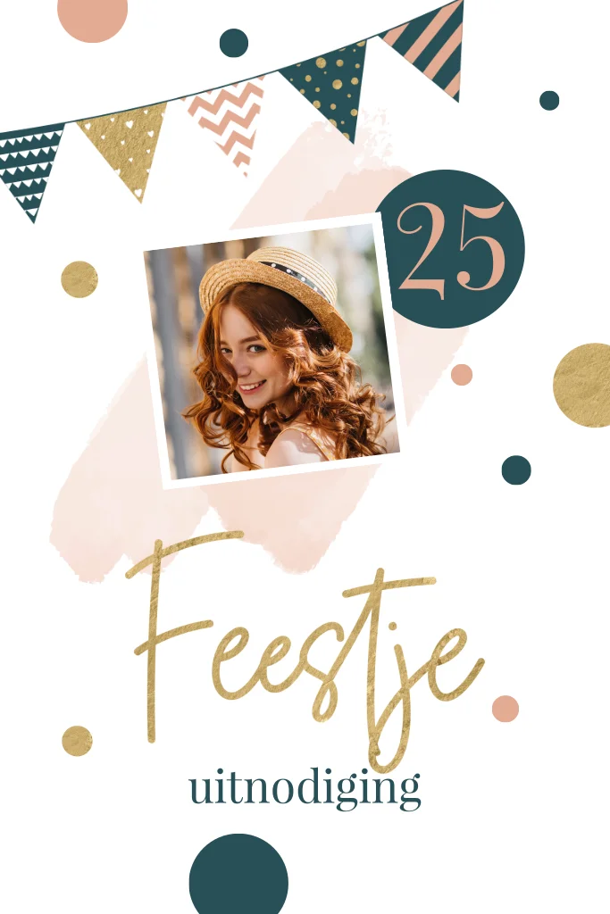 25 jaar verjaardag uitnodiging met foto en vlaggetjes in frisse en moderne kleuren (23441)