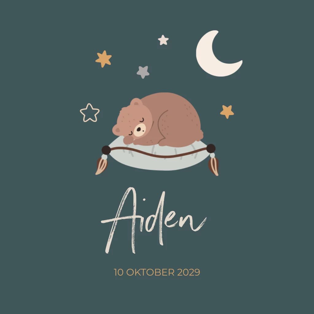 Geboortekaartje beer jongen met een lief getekend beertje slapend op een kussen met sterren en een maan. (24206)