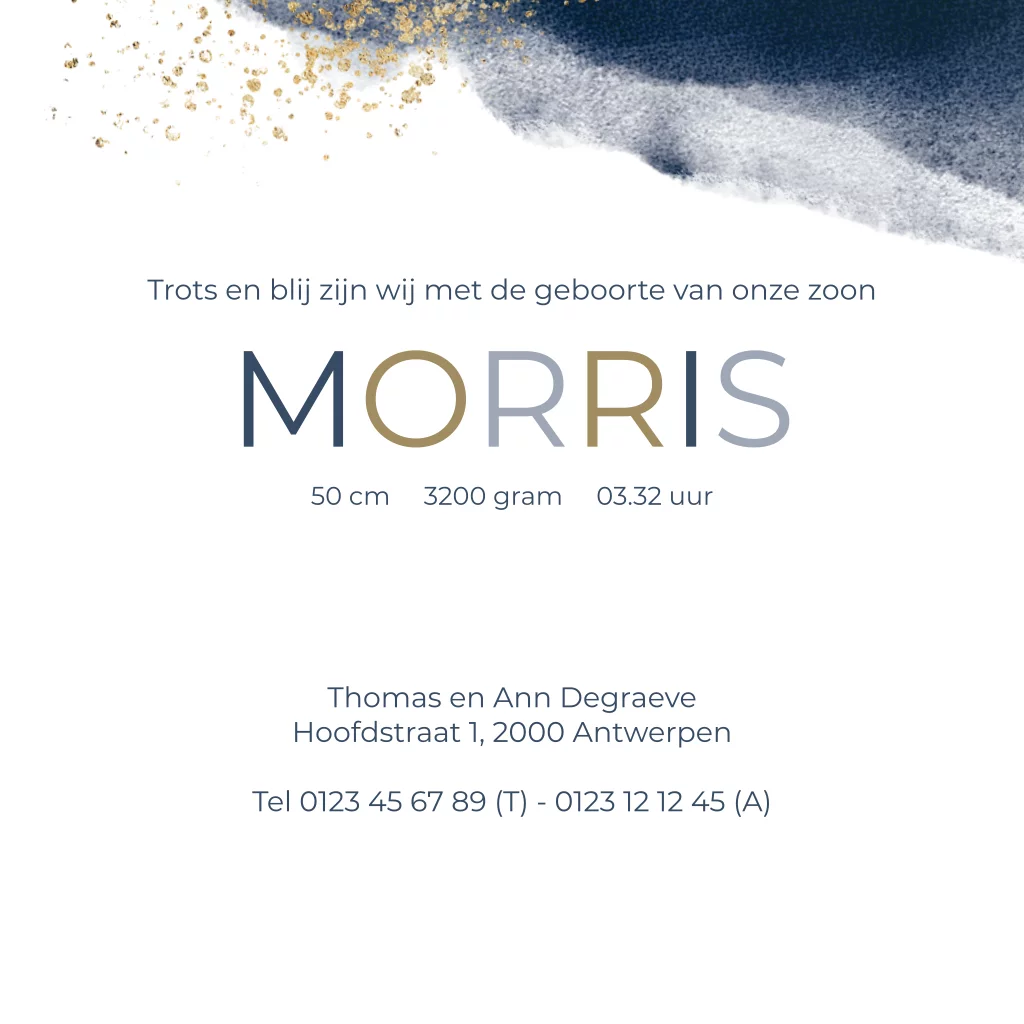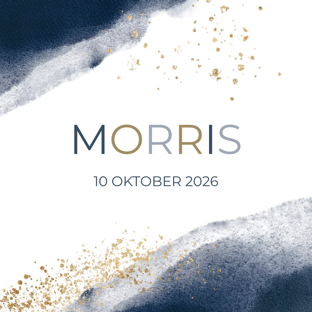 Geboortekaartje modern en trendy voor een jongen met grappig detail, de letters in verschillende kleuren. Met donkerblauwe getekende waterverf en goudkleurige spetters. (24007)
