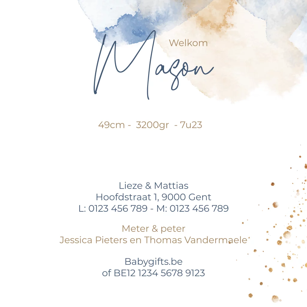 Geboortekaartje voor een jongen met blauwe en zandkleurige watercolor. (24205)