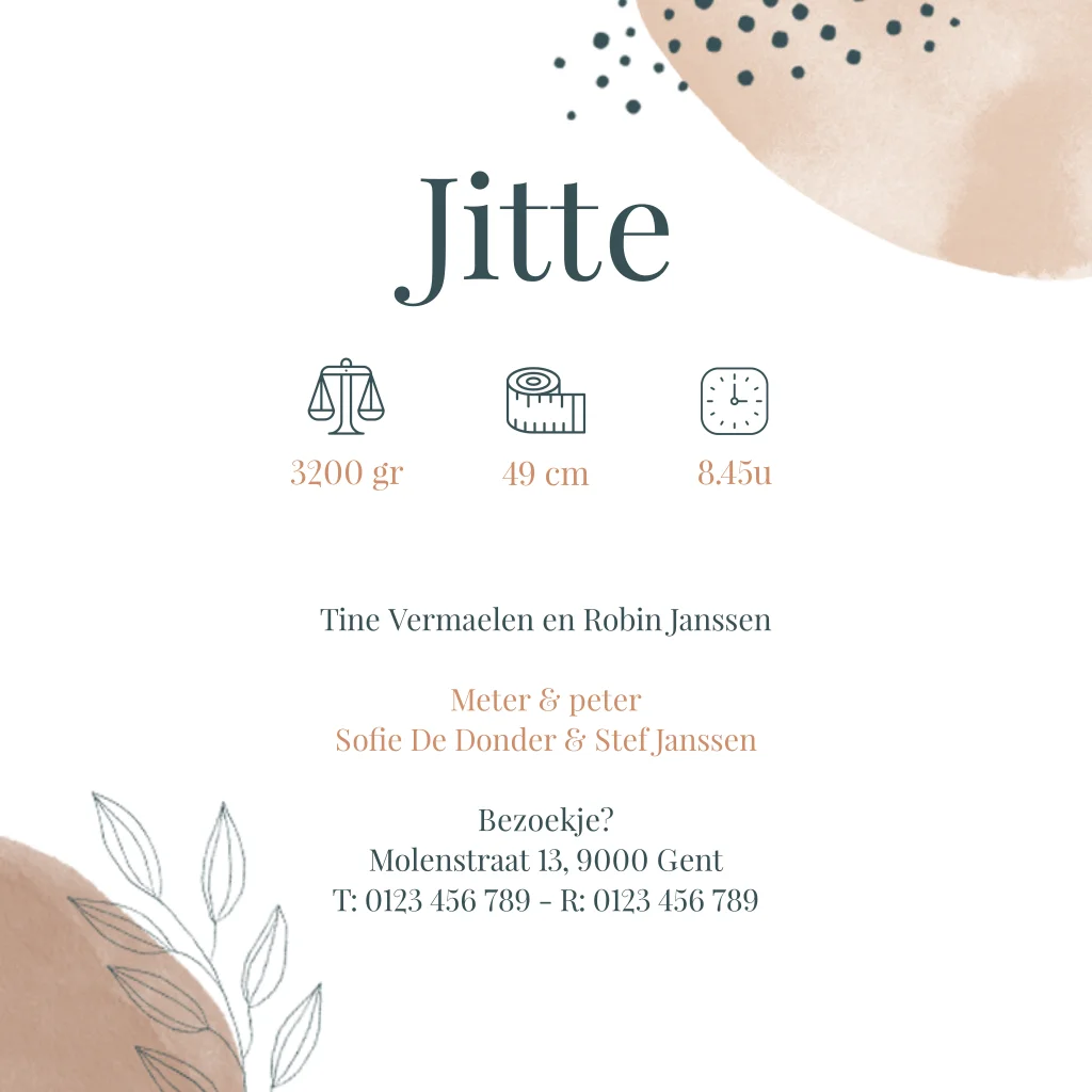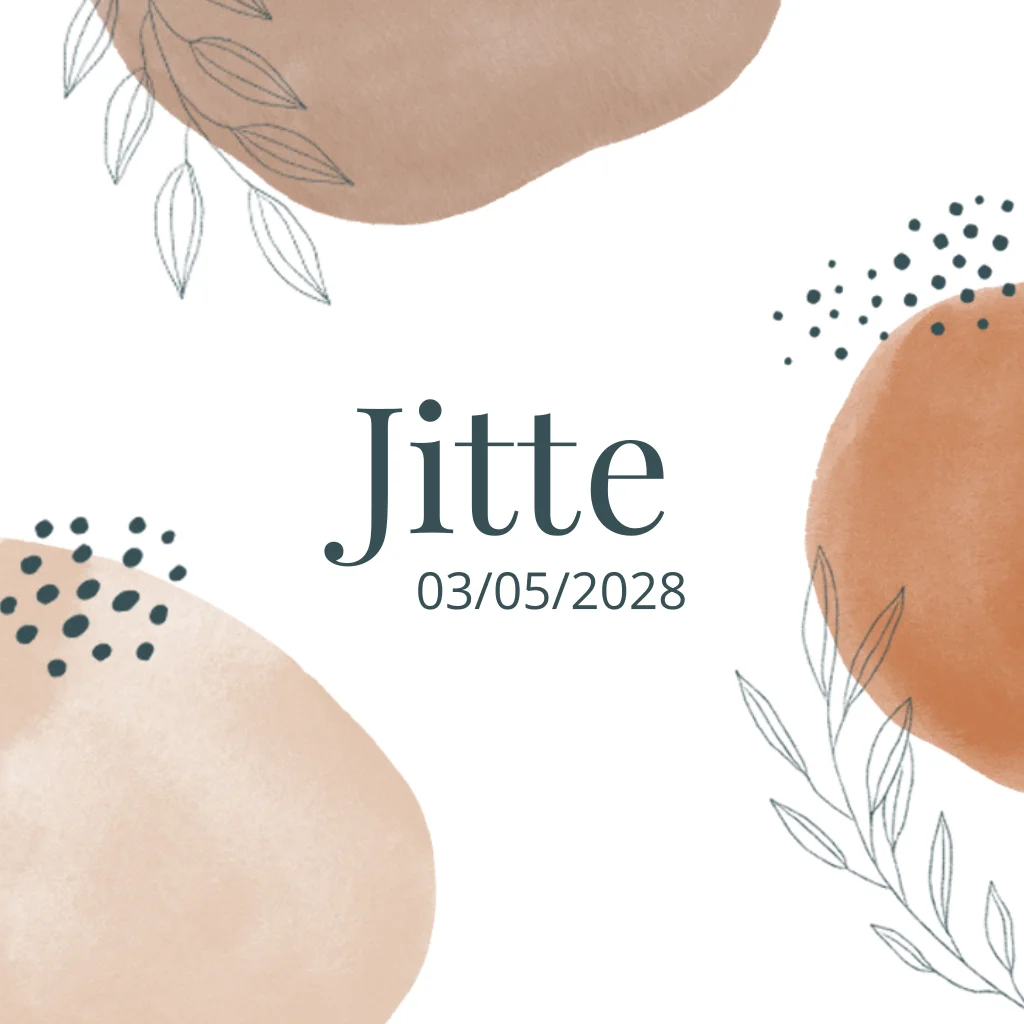 Trendy geboortekaartje voor een meisje in warme aarde tinten met abstracte en botanische element. (23438)