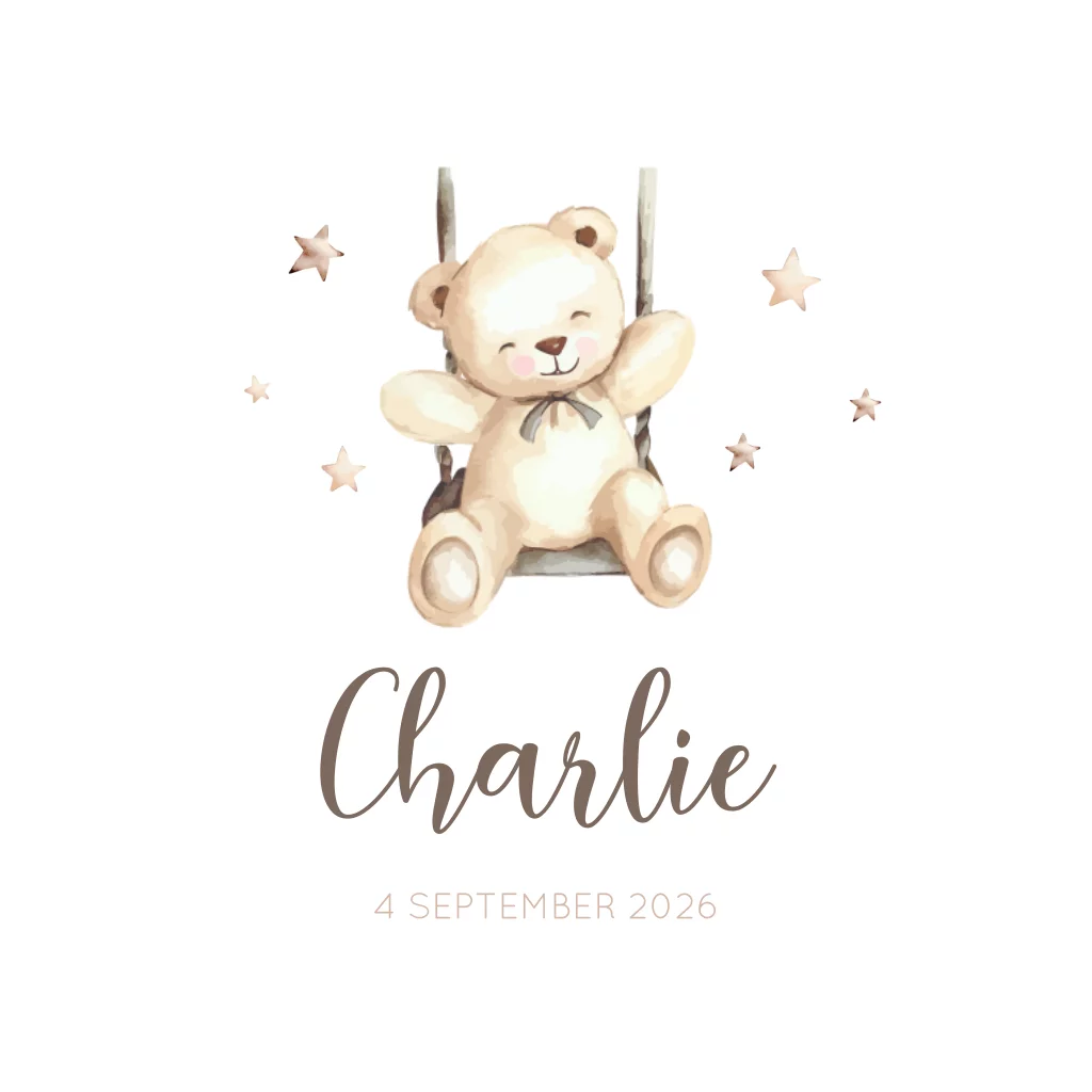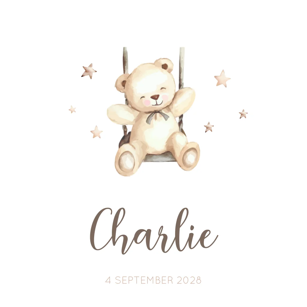 Leuk geboortekaartje teddybeer met een schattig getekend beertje op een schommel. Voor een jongen of meisje. (23871) Geboortekaartje Riley