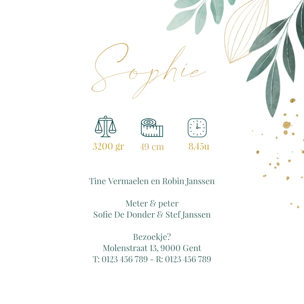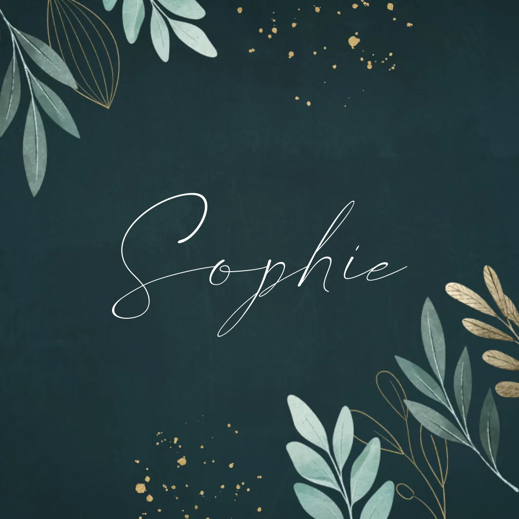 Bladeren geboortekaartje meisje met botanische tekeningen en spetters op een donkere achtergrond. Geboortekaartje Sophie Met goudfolie. (24087)