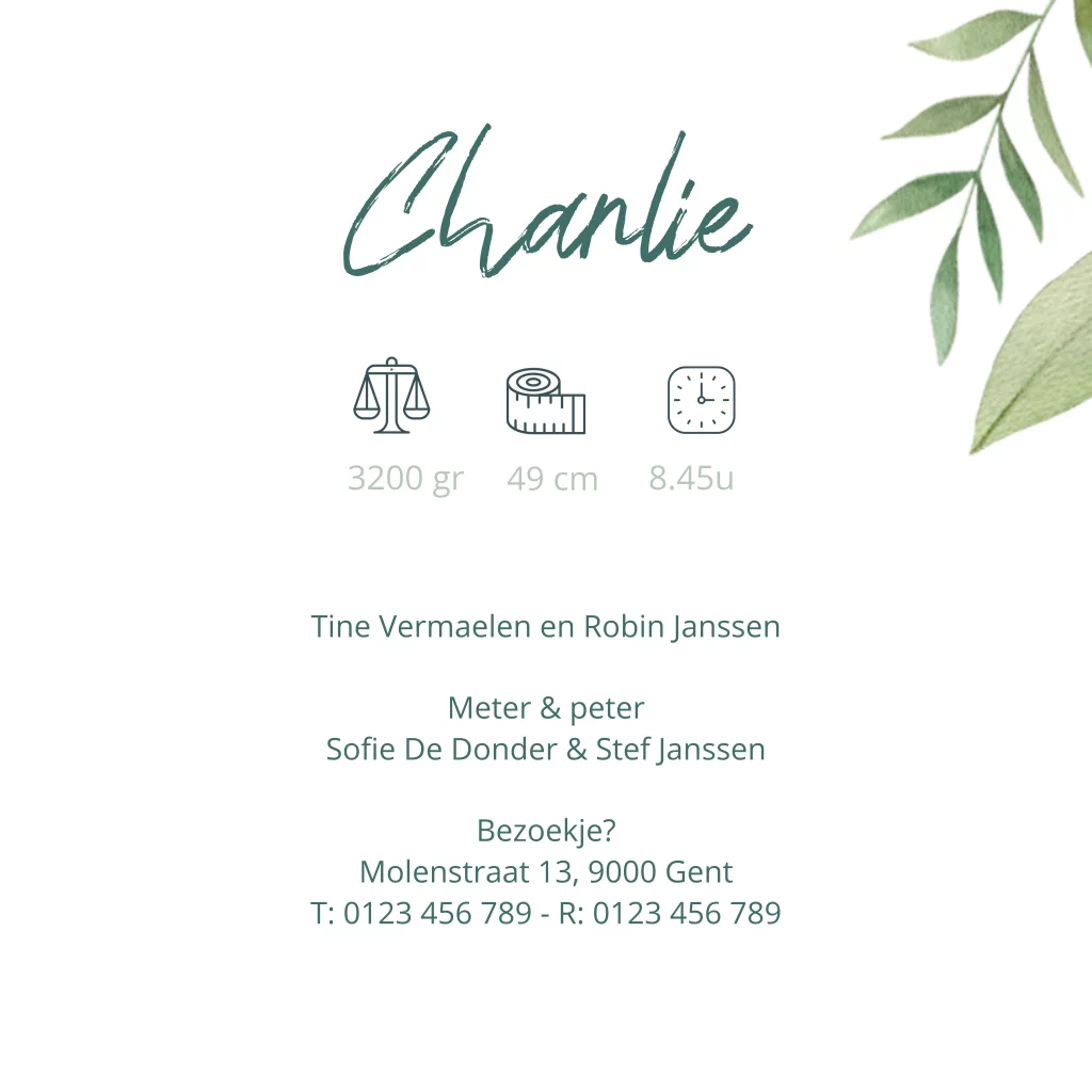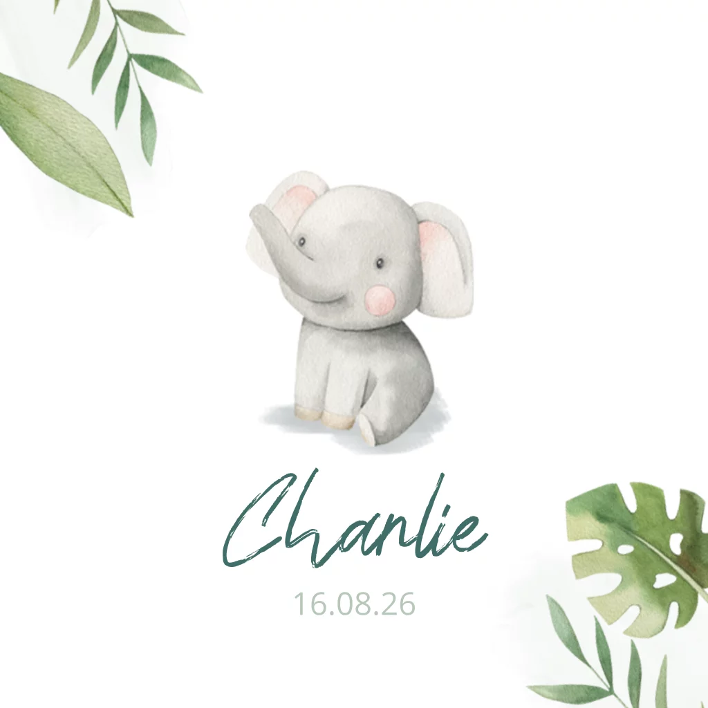 Schattig geboortekaartje met getekend olifantje en botanische tekeningen van bladeren en takken. (23751) (Dit kaartje heeft nu ronde hoeken a € 0,30 per kaartje)