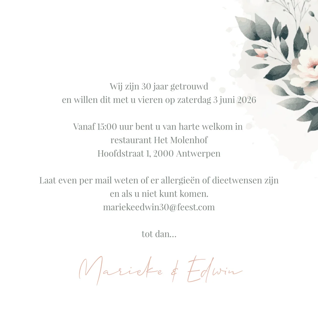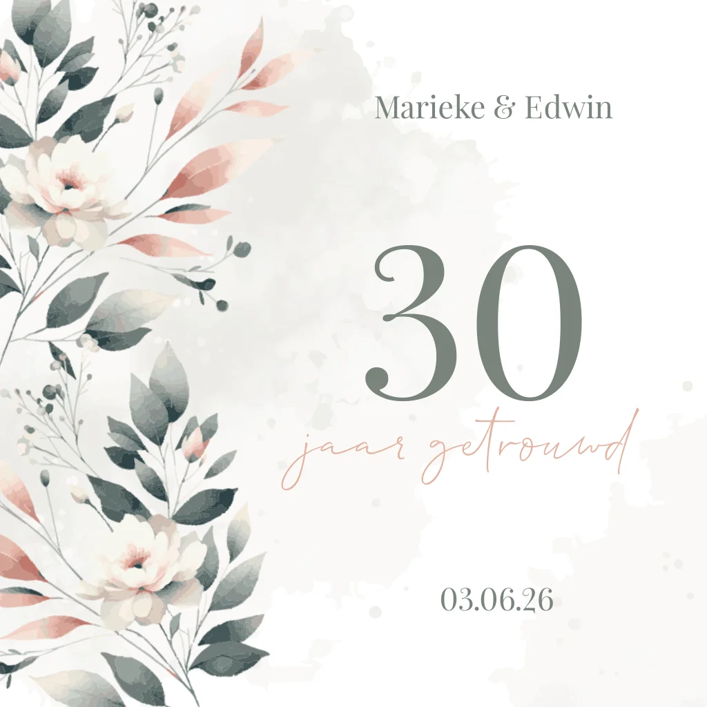 Jubileum uitnodiging 30 jaar getrouwd met trendy en moderne getekende botanische elementen. (24009)