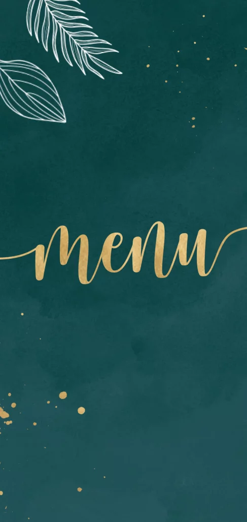 Trendy menukaart met botanische elementen en spetters op een donkere achtergrond. Met groen, takjes en menu in goud look. (23027)