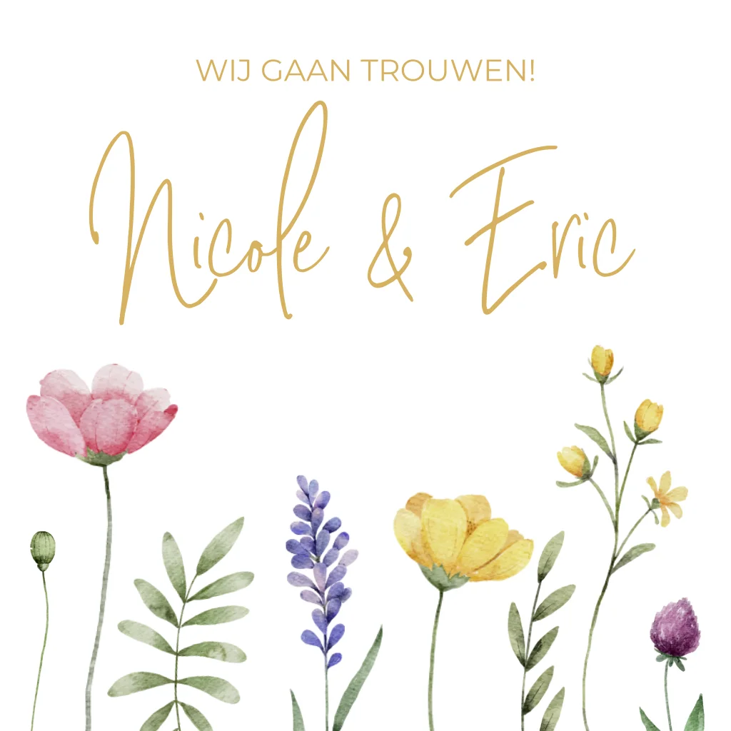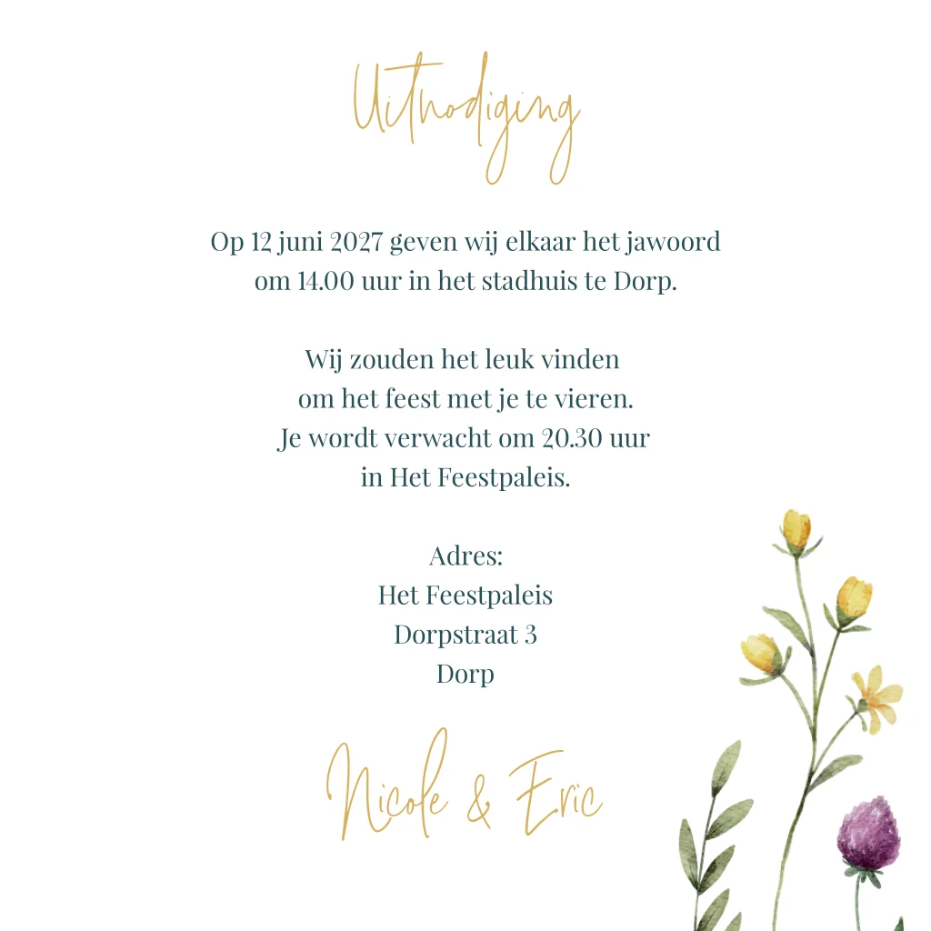 Voorbeeld trouwkaart met veldbloemen in frisse kleuren
