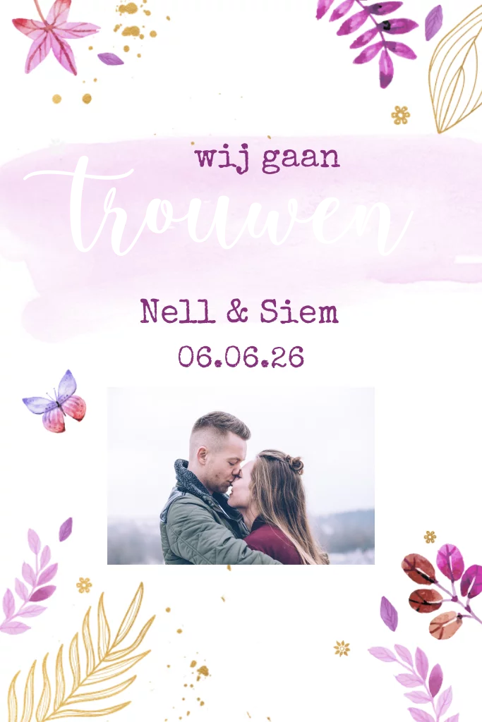 Kleurrijke trouwkaart met vlinder en waterverf achtergrond. Ook is er ruimte om een eigen foto te plaatsen op de voorkant, maar kan ook zonder foto. (22905)