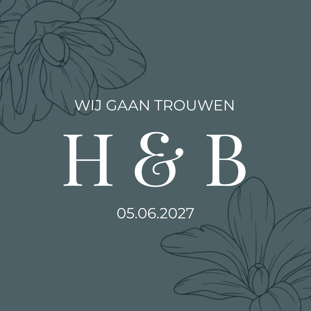 Stijlvolle trouwkaart met lijntekeningen van bloemen op een donker groene achtergrond op de voorkant waar ook de voornamen van bruid en bruidegom in goudfolie zijn gedrukt (22995)