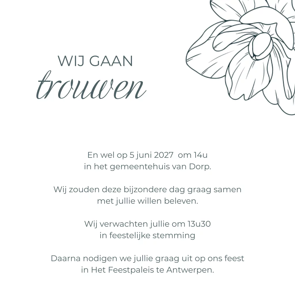 Trouwkaart groen met sierlijke bloemen en foliedruk