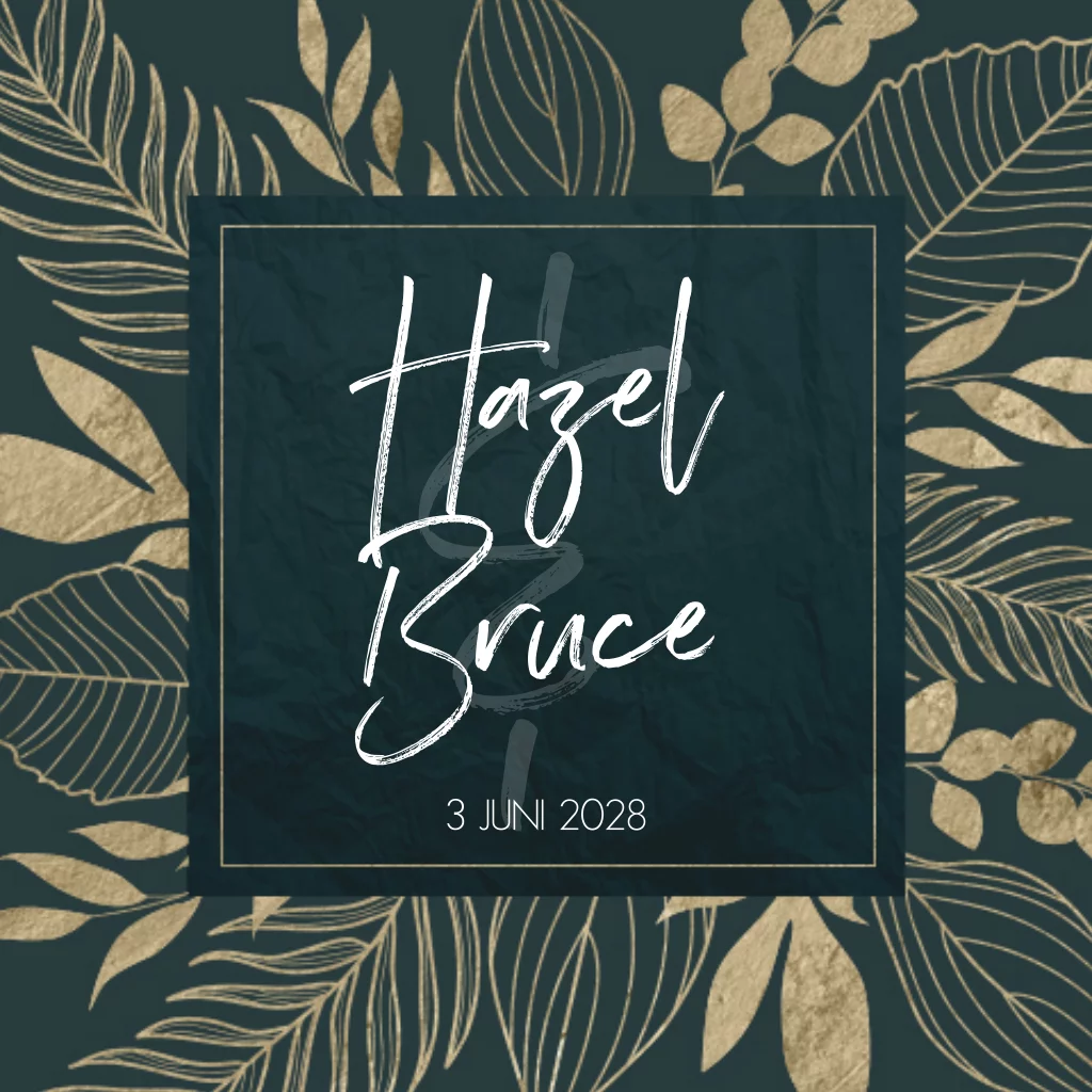 Stoere trouwkaart met een rand van goudkleurige lijntekeningen van bladeren. Luxe botanische en bohemian stijl thema. (23484)