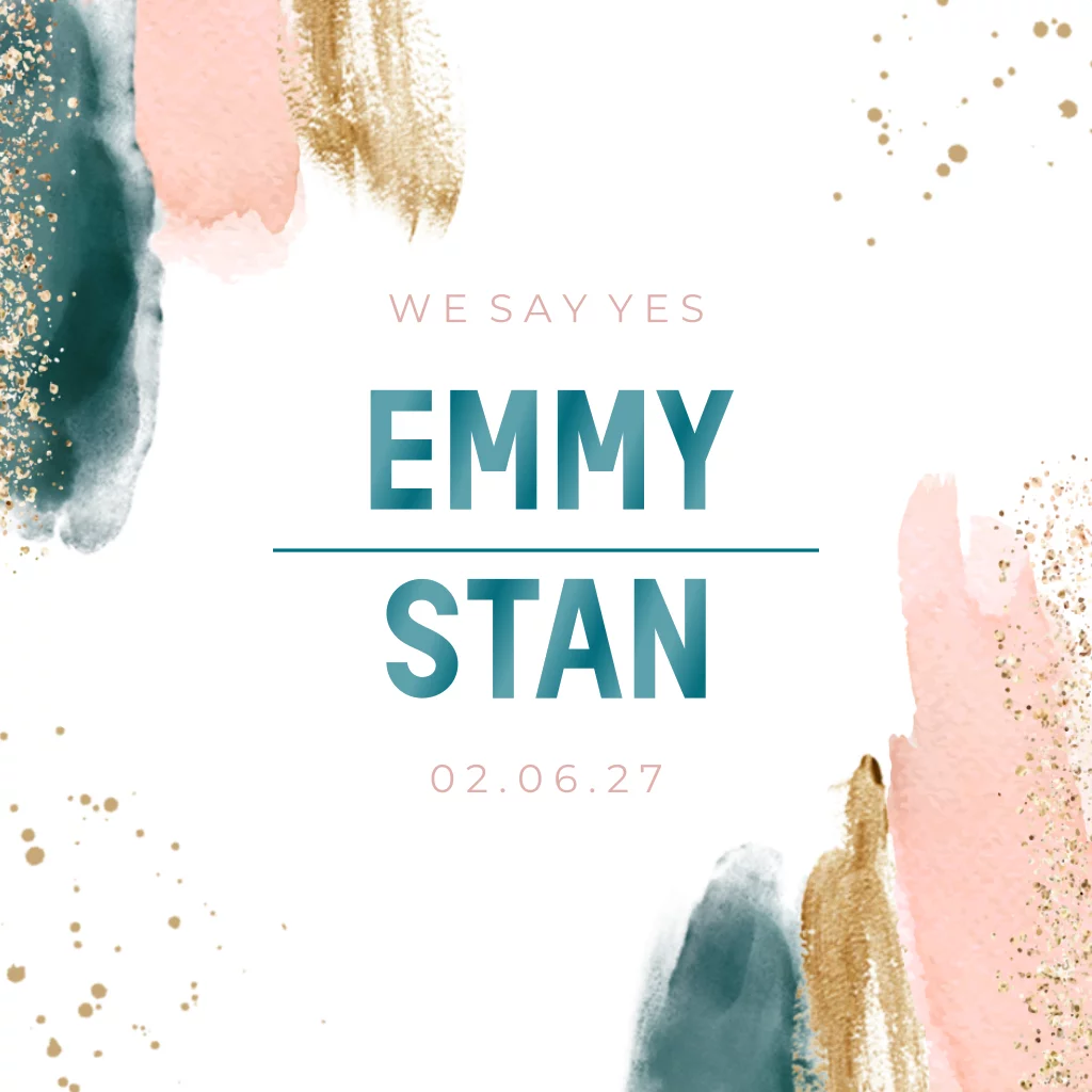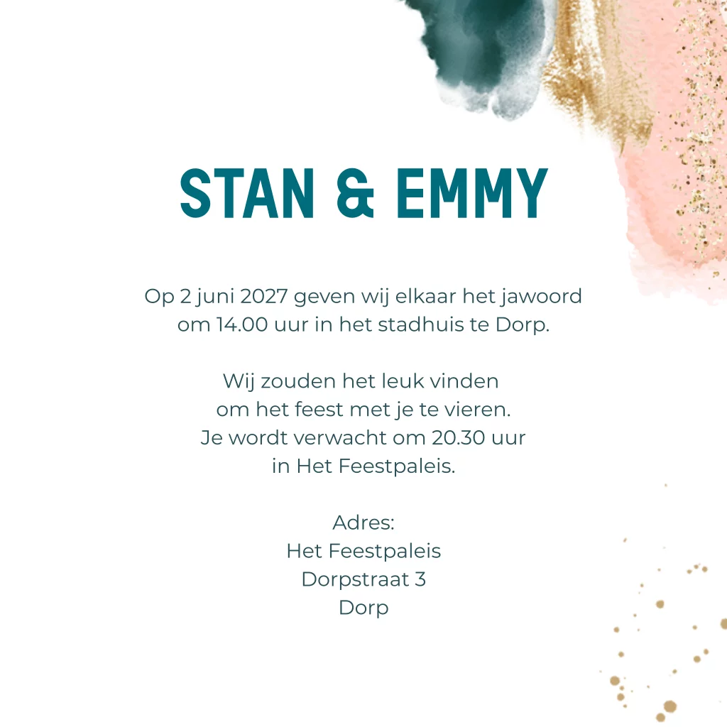 Trouwkaart modern met verfstrepen roze en groen