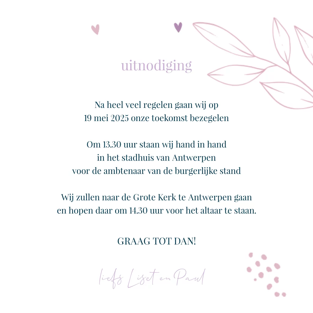 Hippe trouwkaart met bloemen, hartjes en de initialen in een cirkel, dit in frisse en moderne kleuren paars, lila en groen. Initialen van de voornamen in goudfolie gedrukt. (23108)