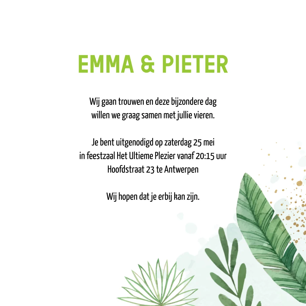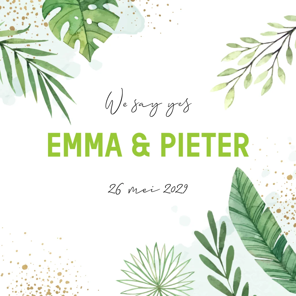 Trouwkaart met goud look spetters en getekende botanisch groene tropische takken en bladeren o peen witte achtergrond. (24371)
