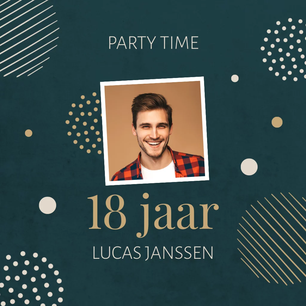 18 jaar uitnodiging met stippen en bollen op een donkere achtergrond. (23571)