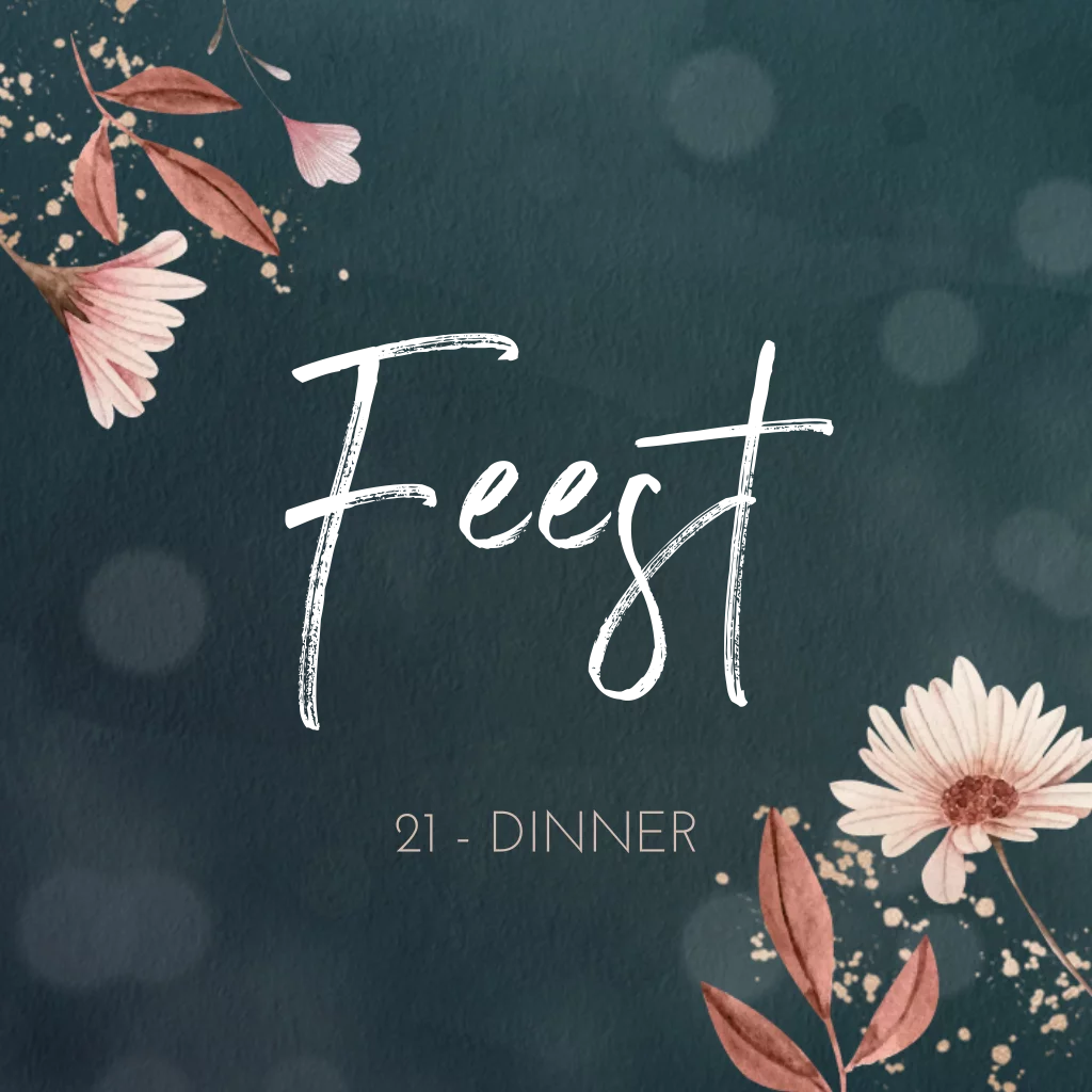 Trendy 21 dinner uitnodiging met getekende bloemen op een donkere achtergrond. Met rosé folie. (23228)