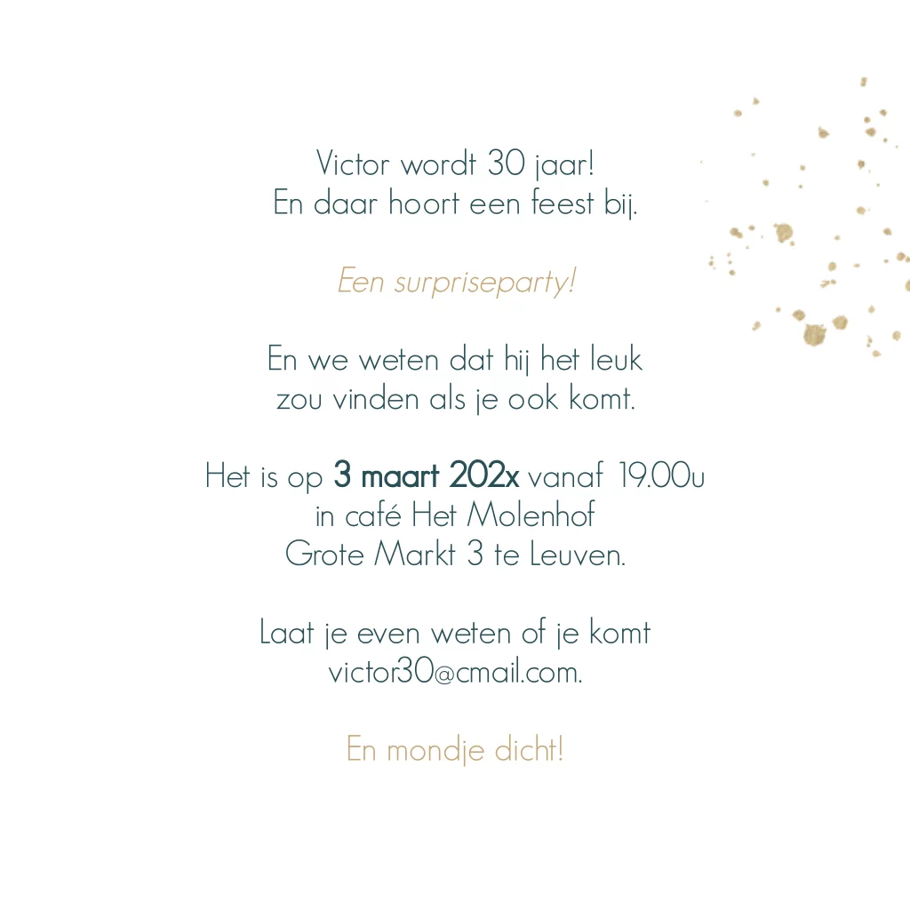 Leuke uitnodiging 30 jaar verjaardag man met pasfoto en goudkleurige slinger en spetters op een donkere achtergrond. (23866)