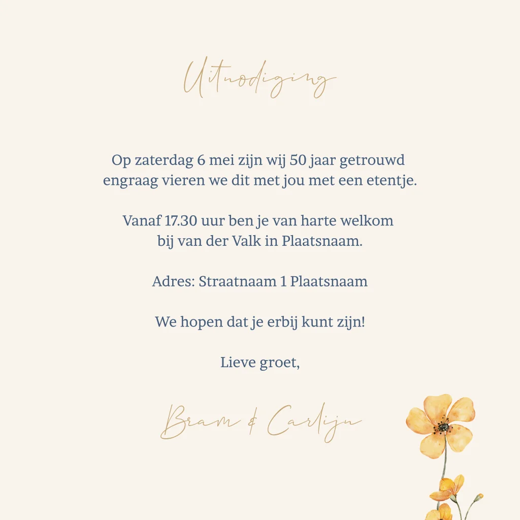 Uitnodiging 40 jaar getrouwd beige met gele bloem