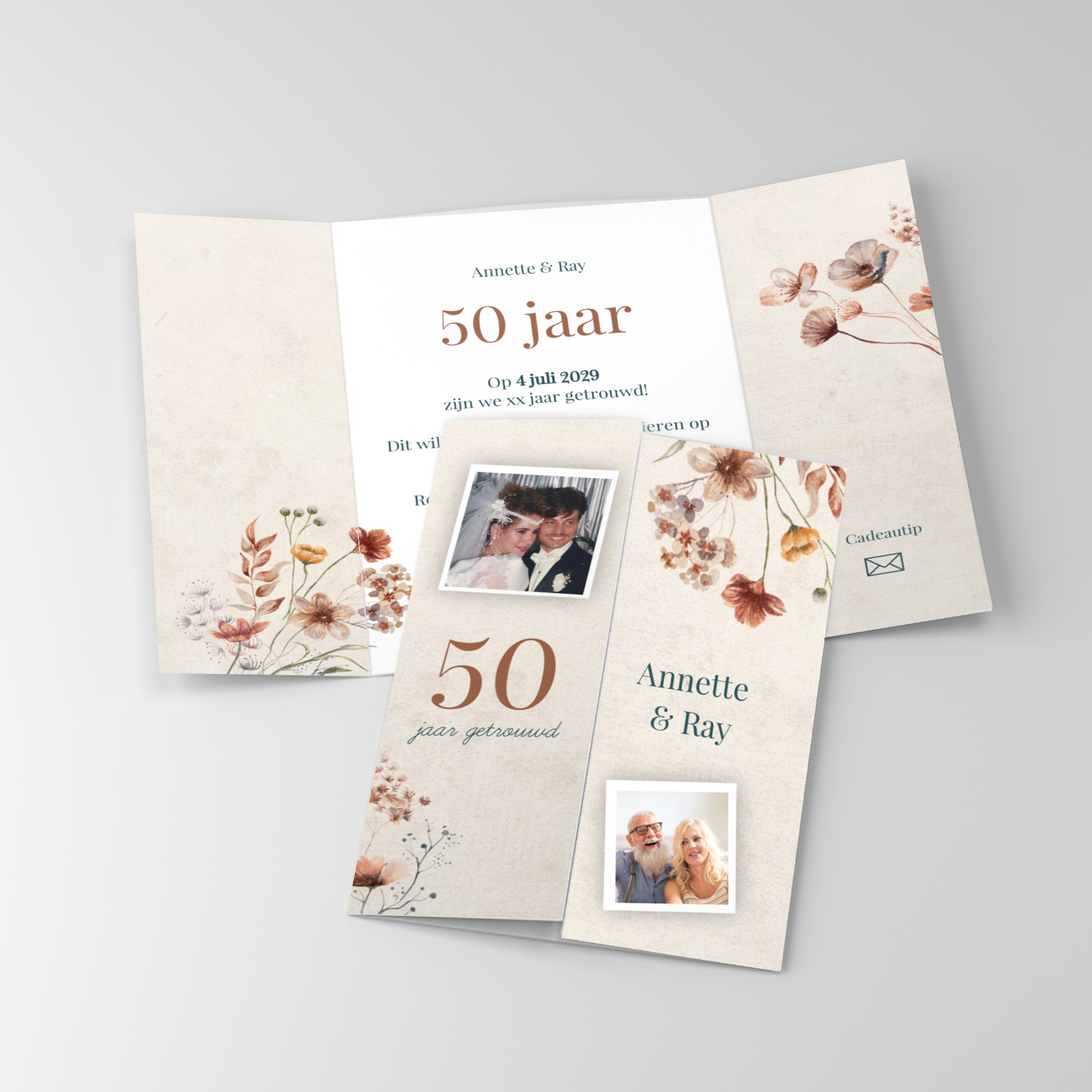50 jaar getrouwd uitnodiging met luikvouw en met getekende bloemen en plaats voor 2 foto's.