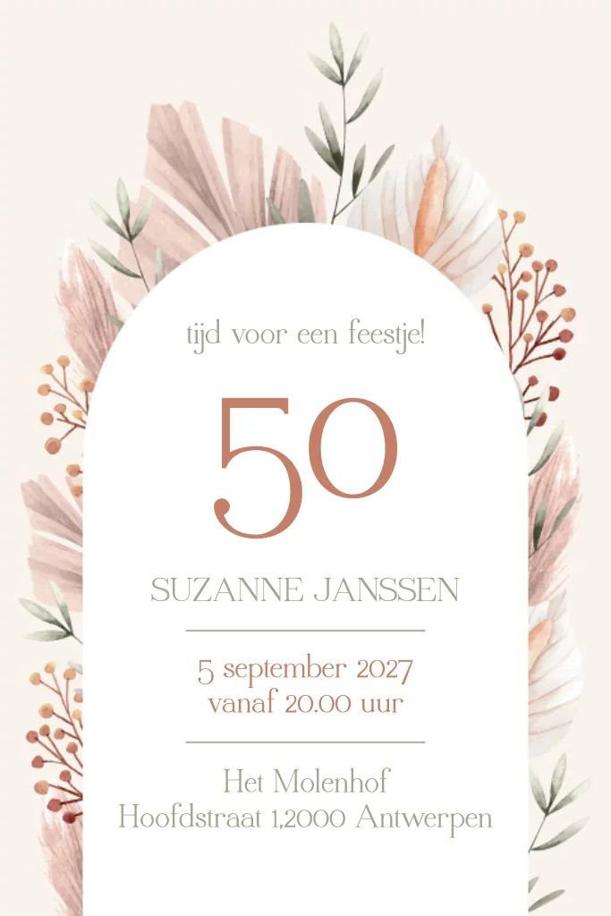 Stijlvolle uitnodiging 50 jaar verjaardag met tekeningen van verschillende droogbloemen en plaats voor tekst vooraan. Met hoogglans koper.