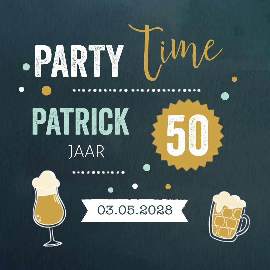 Uitnodiging 50ste verjaardag man met bier en confetti foto binnenkant