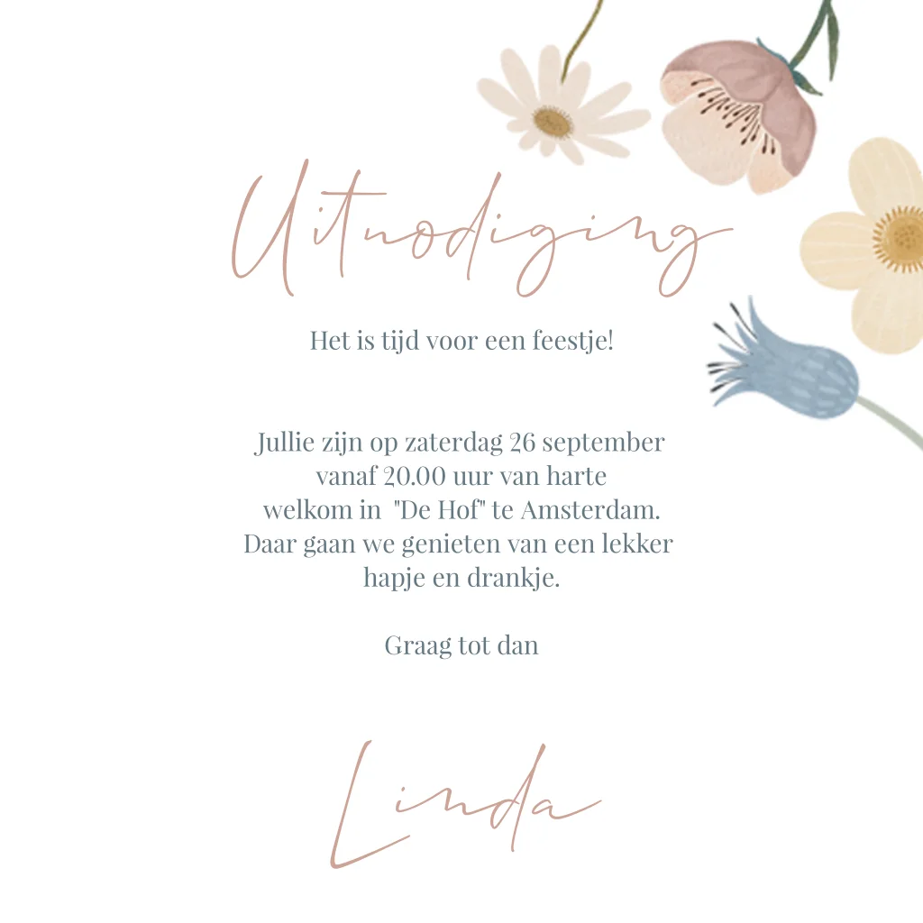 Een moderne uitnodiging voor een feestje zoals een 60e verjaardag met gekleurde bloemen en takjes. (30153)