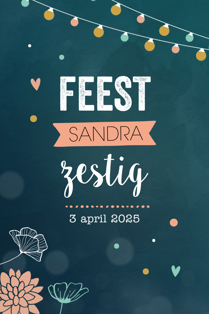 Leuke uitnodiging met lampjes en bloemen op een donkere achtergrond. Met goudfolie. (23229)
