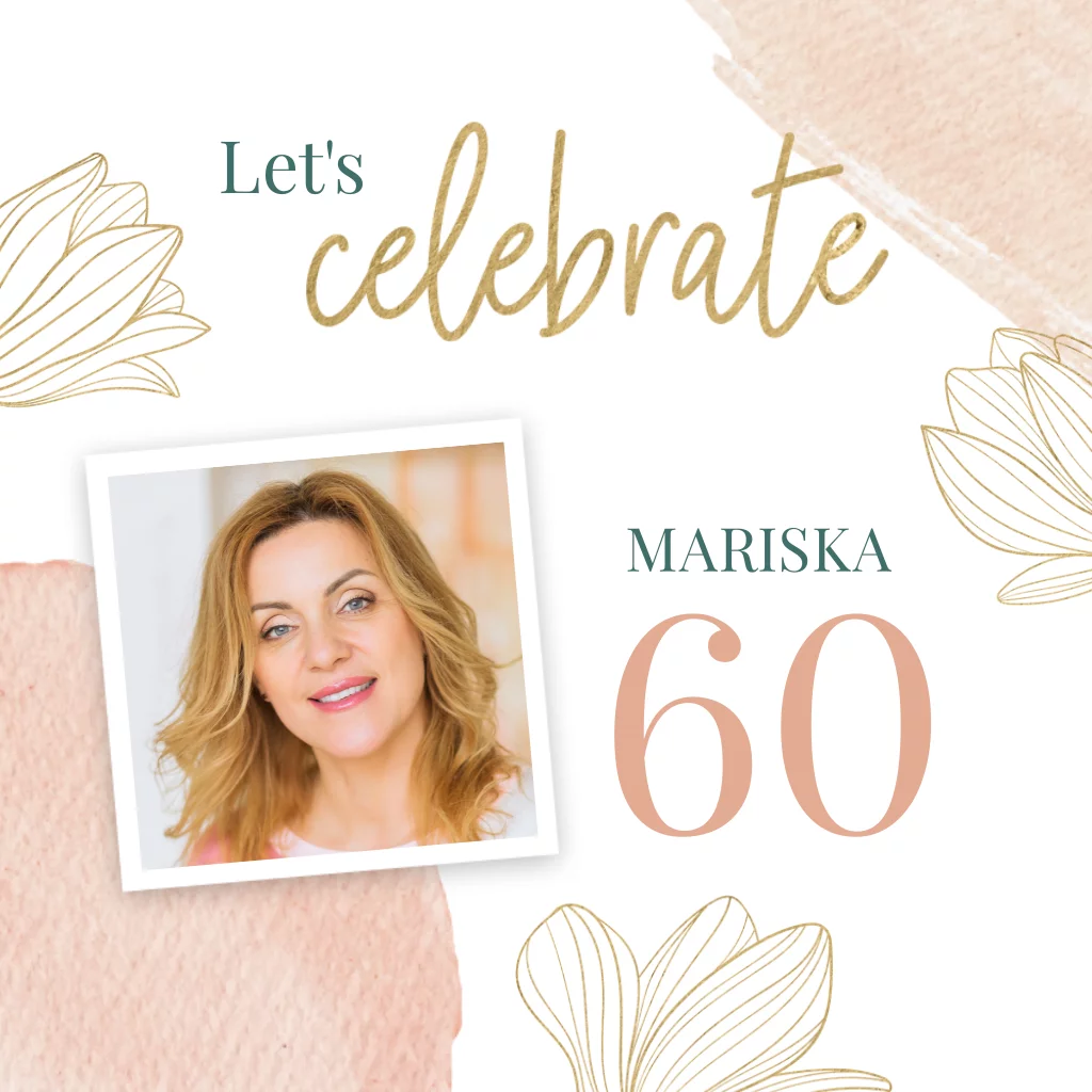 60 jaar vrouw uitnodiging met waterverf elementen en sierlijke bloemen. Ruimte voor een eigen foto. (23951)