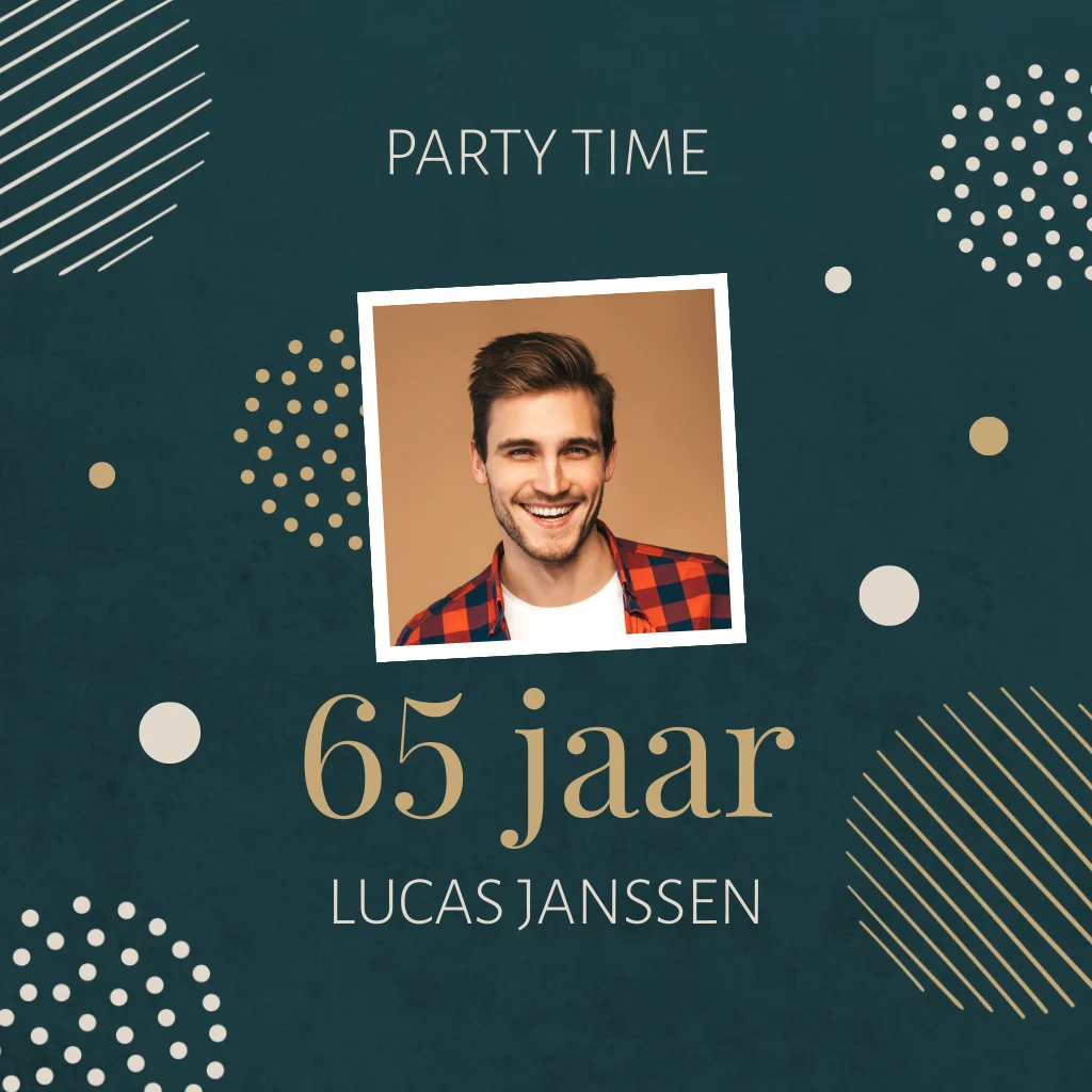 Moderne uitnodiging 65 jaar verjaardag met stippen en bollen op een donkere achtergrond. (23571)