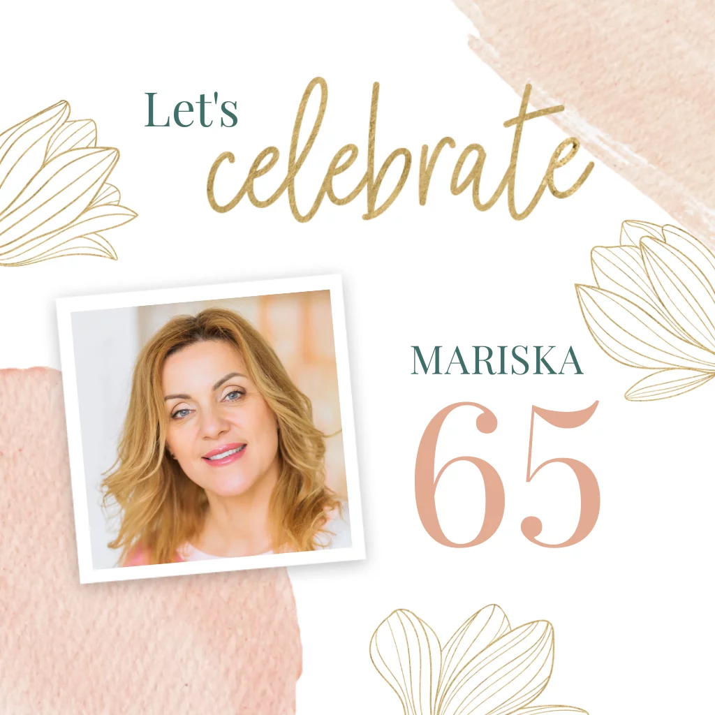 Trendy uitnodiging 65 jaar met waterverf elementen en sierlijke bloemen. Ruimte voor een eigen foto. (23951)