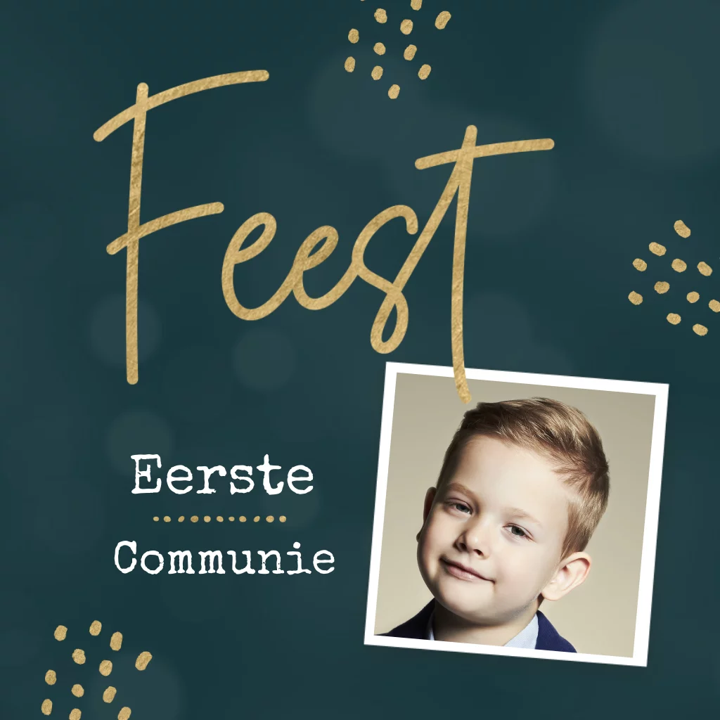 Hippe uitnodiging eerste communie met abstracte elementen en foto. (23263)