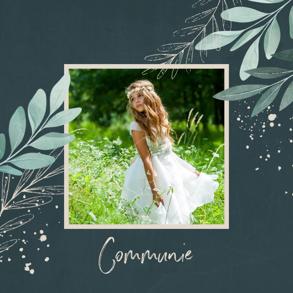 Moderne uitnodiging eerste communie met botanische elementen en ruimte voor een eigen foto. (23914)
