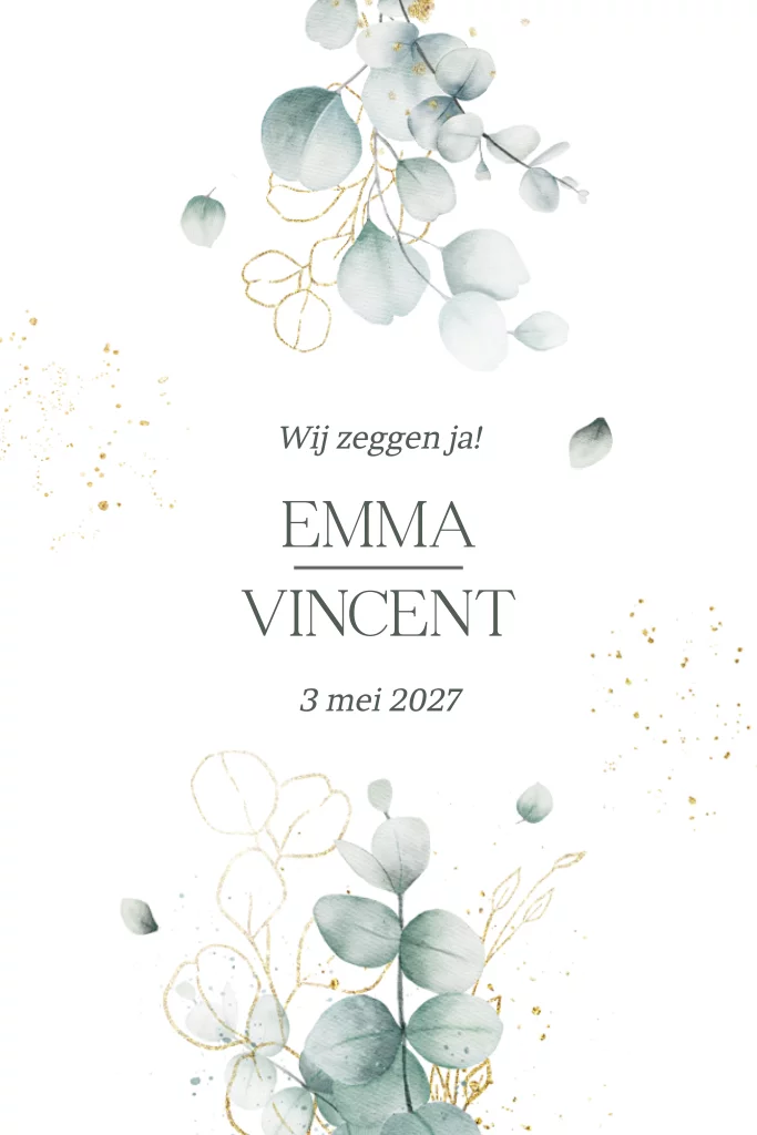 Botanical trouwkaart met getekende bladeren bovenaan en onderaan en goudkleurige spetters. (23483)