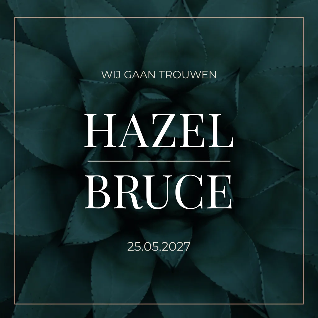 Moderne trouwkaart met een foto van een vetplant als achtergrond. Met rosé goudfolie namen op de voorkant voor een extra luxe uitstraling. (23373)