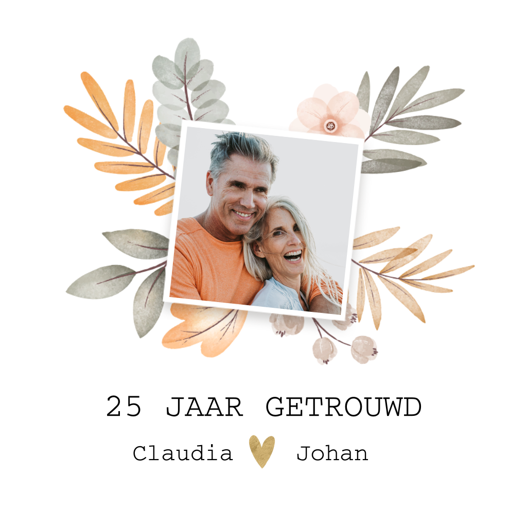 25 jaar getrouwd uitnodiging met getekende bloemen en plaats voor een mooie foto. (23259)