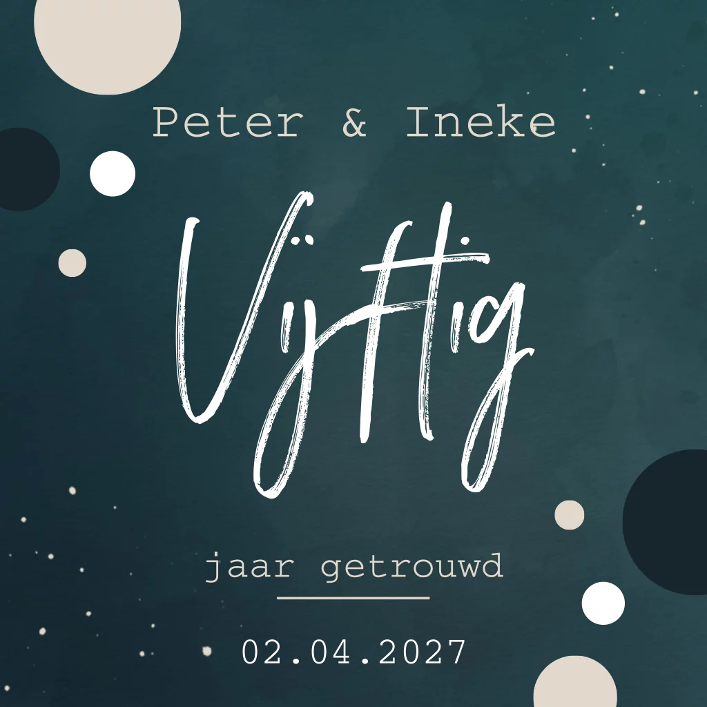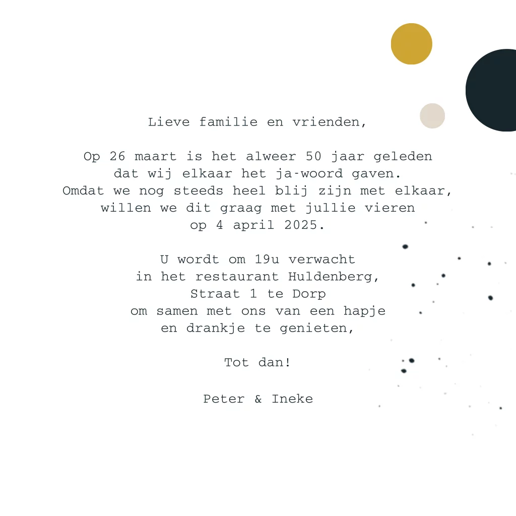 50 jarig jubileum uitnodiging met spetters en stippen op een donkere achtergrond. Met goudfolie. (23262)